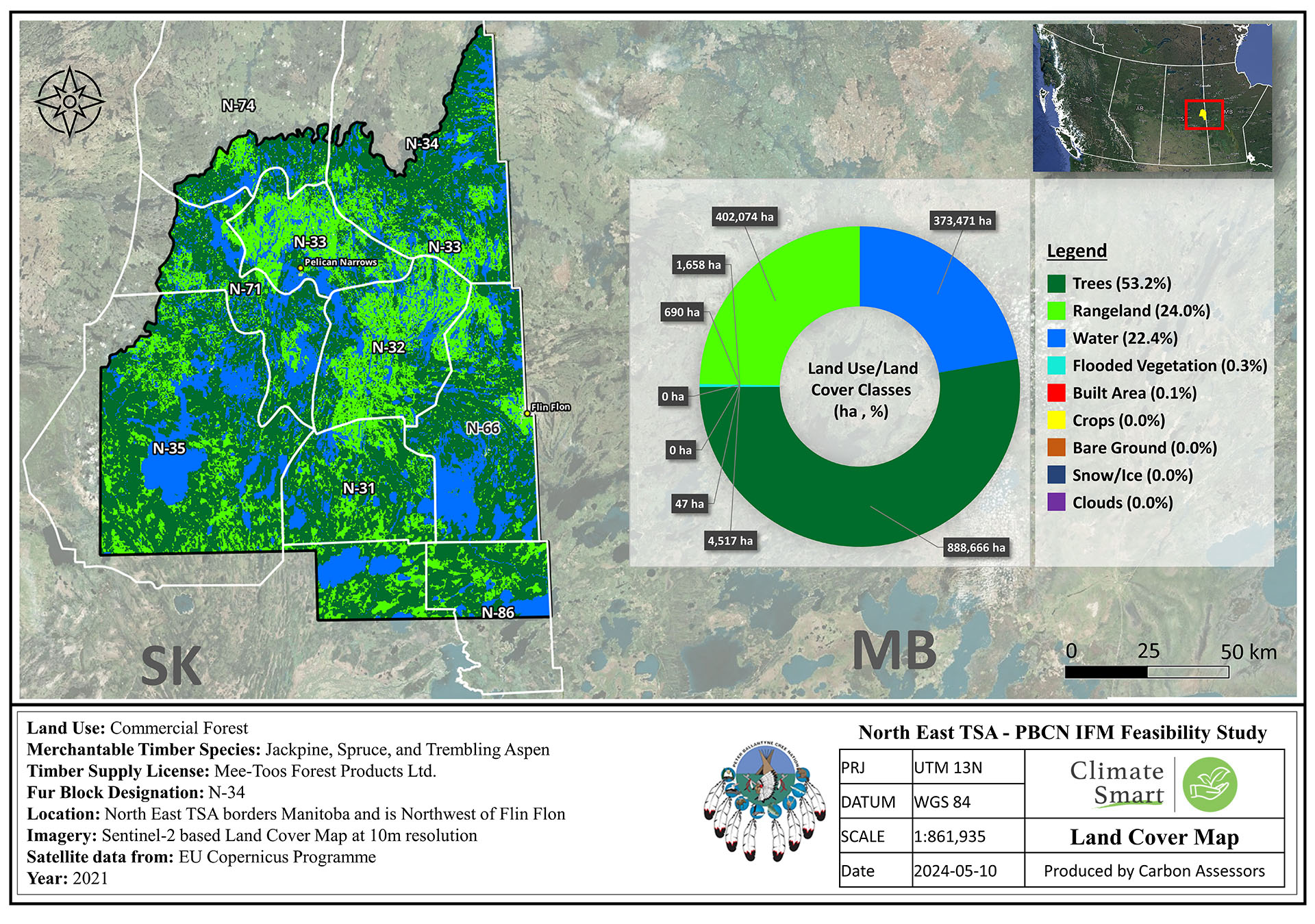 PBCN’s Traditional Territory encompasses over 50,000 square kilometers, 888,888 hectares of which is occupied by boreal forest land bound by community-held Fur Block Licenses. These Fur Blocks represent the project areas in which IFM techniques like strategic harvesting, wildfire management, and conservation area establishment—conducted by PBCN’s own community members—are used to: